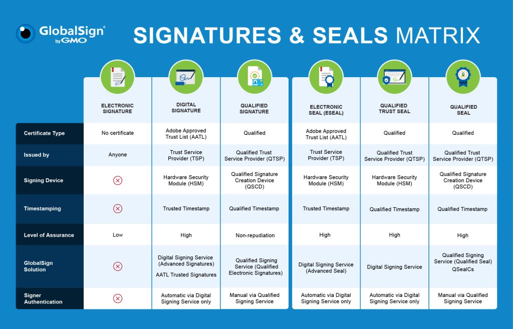 Digital signatures meet global regulatory standards and provide the highest level of identity assurance. They are cryptographically linked to the signed document and can be verified to ensure authenticity and integrity.